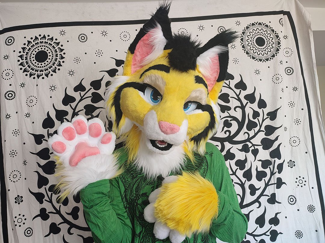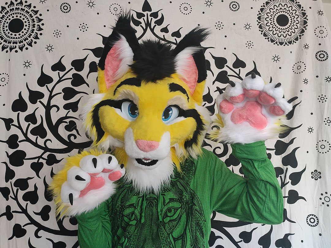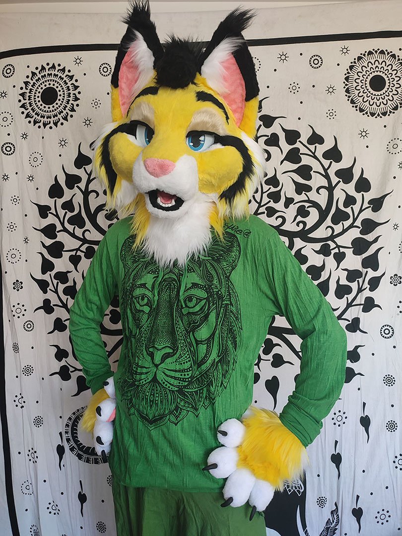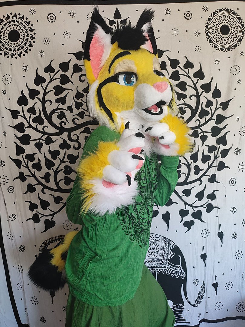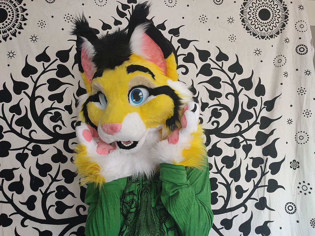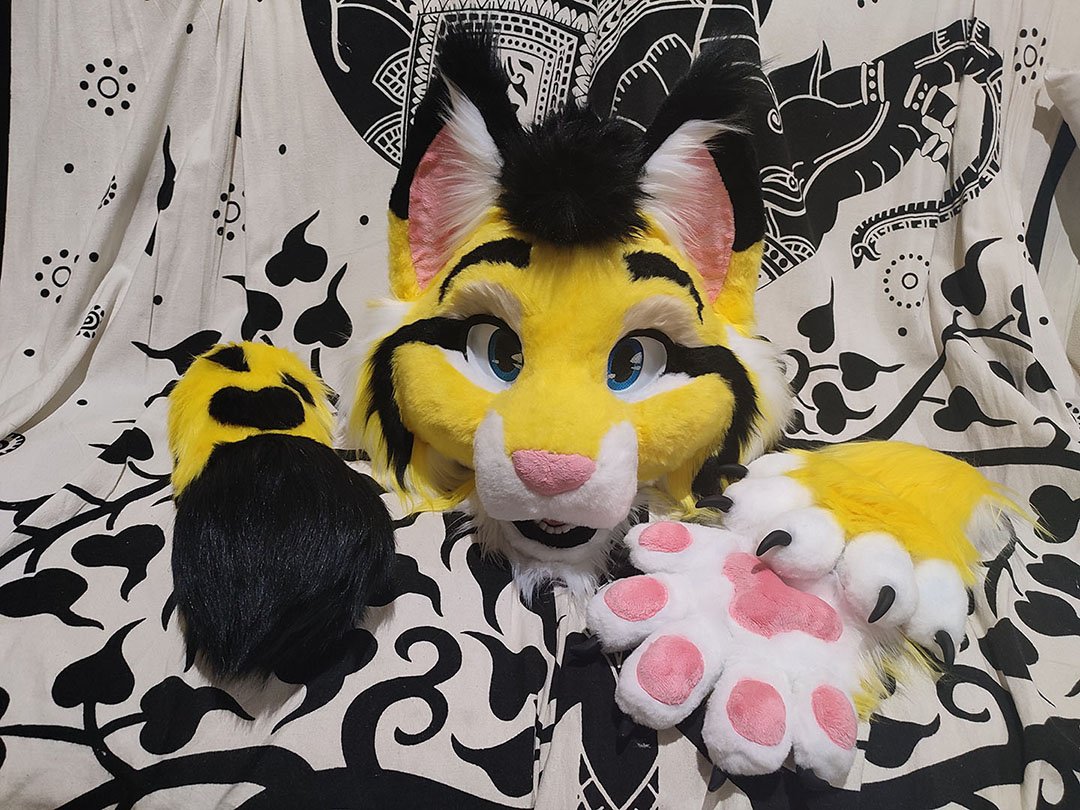 Head is modeled from scratch with foam, using as guide the feline patron from [url=https://twitter.com/Kloofsuits]KloofsuitsUK[/url]. Eyes are 3D printed in follow-me-eyes shape. Tongue uses pink minky and teeth are made with Fimo. Head is fully lined inside and has good vision. As accesories we added a pair of magnetic eyelids (removable), and ying-yang marks behind each ear, sewn by hand.