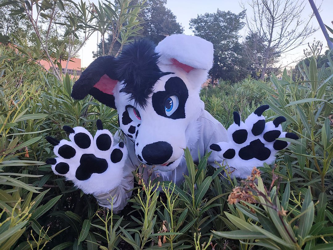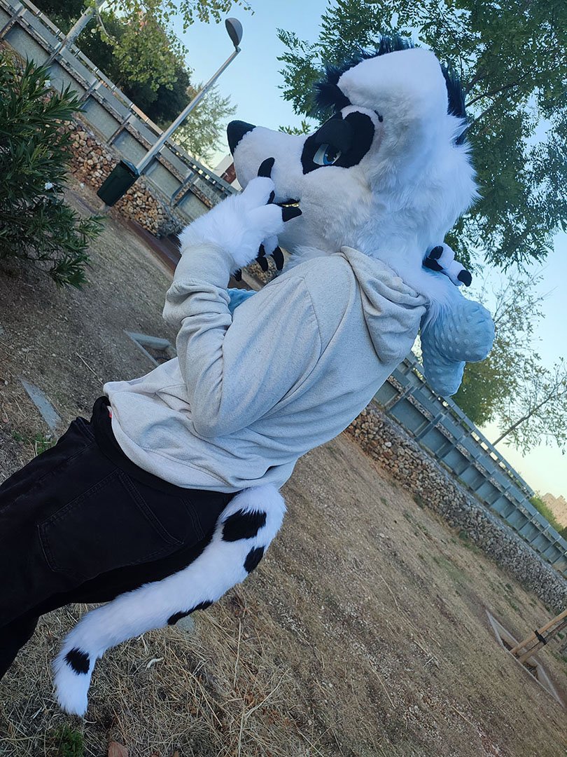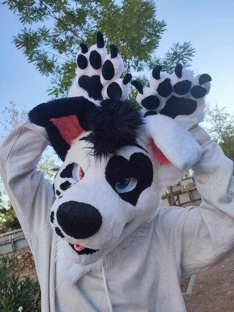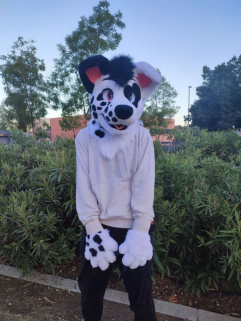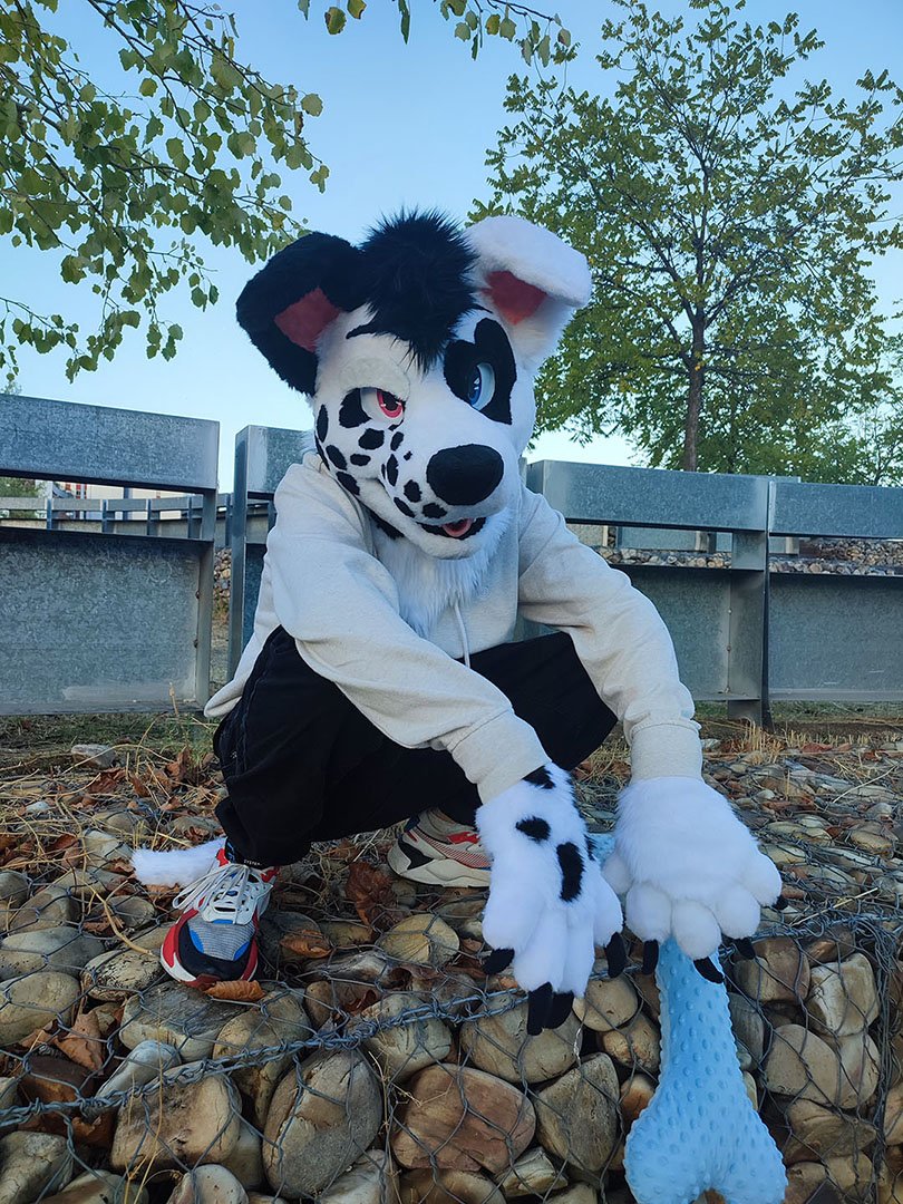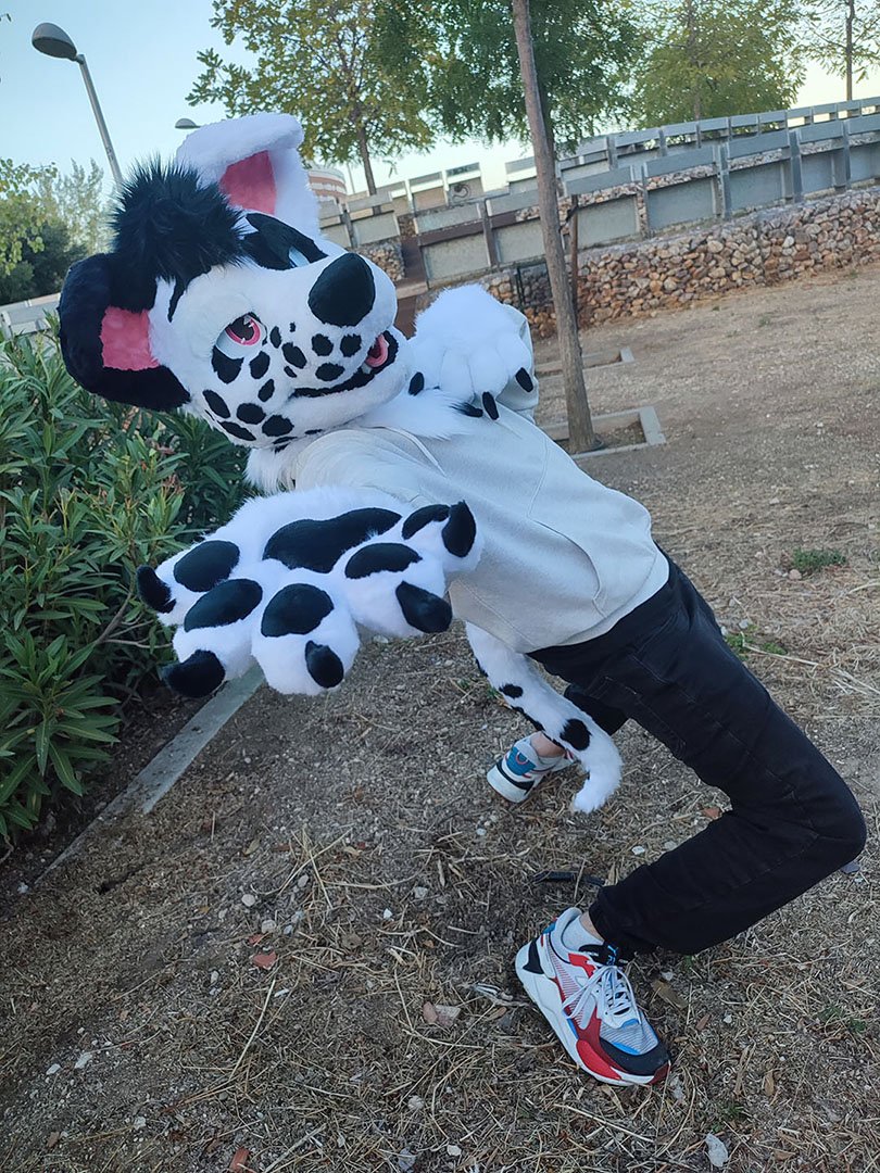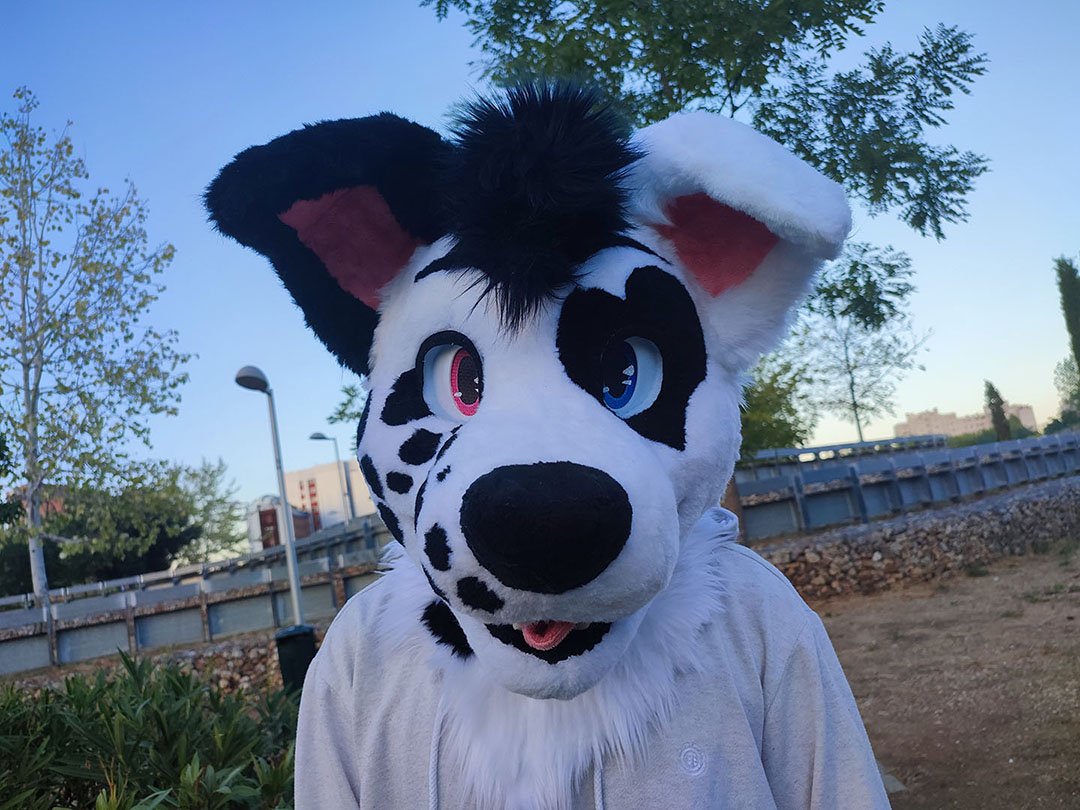 The head is a base bought from [url=https://twitter.com/WMW66Costumes]WMW66 Costumes[/url]. Eyes are 3D printed in follow-me-eyes shape. Tongue uses pink minky and teeth are made with Fimo. Head is fully lined inside and has good vision. As accesories we added a pair of magnetic eyelids (removable), and each spot is sewn by hand.