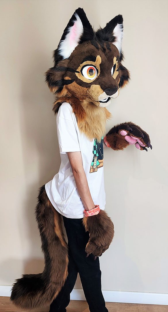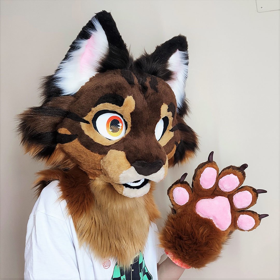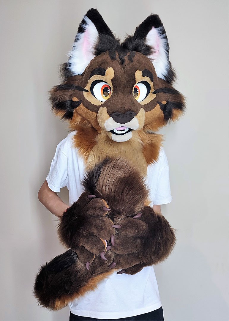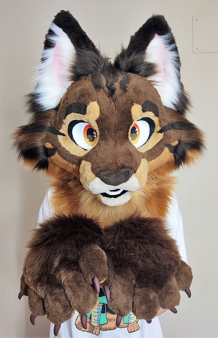 Head is modeled from scratch with foam, using as guide the feline patron from [url=https://twitter.com/Kloofsuits]KloofsuitsUK[/url]. Eyes are 3D printed in follow-me-eyes shape. Tongue uses pink minky and teeth are made with Fimo. Head is fully lined inside and has good vision.