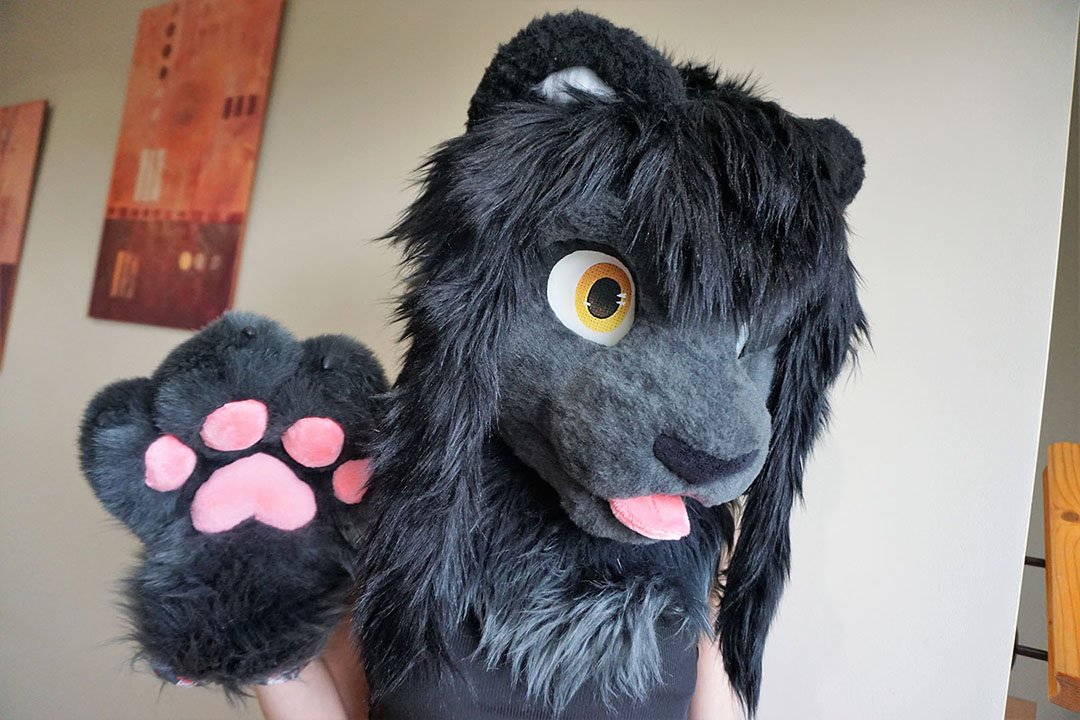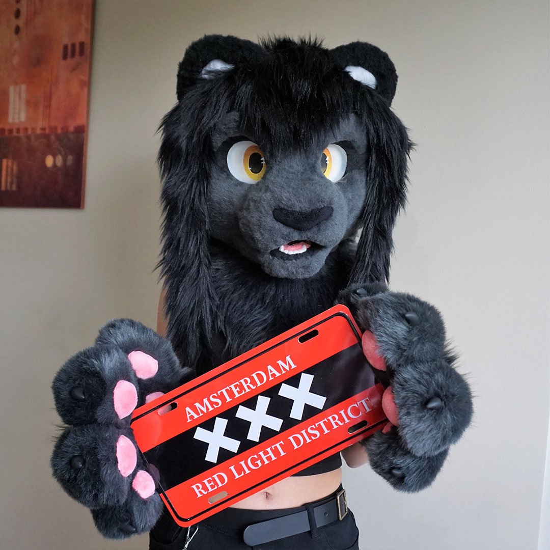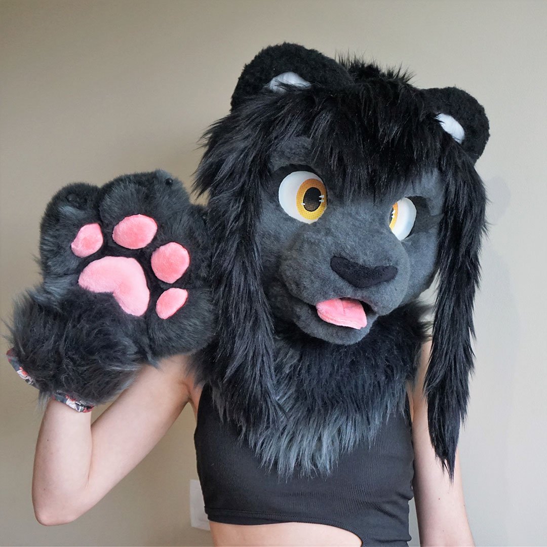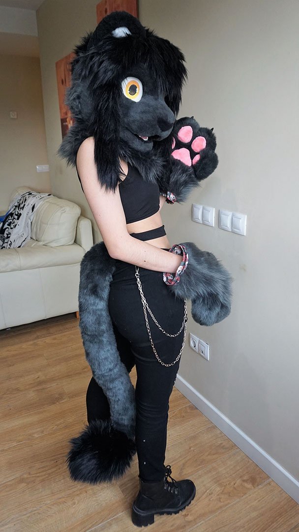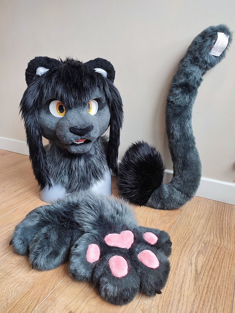 Head is modeled from scratch with foam, using as guide the feline patron from [url=https://twitter.com/Kloofsuits]KloofsuitsUK[/url]. Eyes are 3D printed in follow-me-eyes shape. Tongue uses pink minky and teeth are made with Fimo. Head is fully lined inside and has good vision. It also has as accesories a pair of magnetic eyelids and two different tongues which can be exchanged via magnets. Hair is made with layers so it has a natural movement.