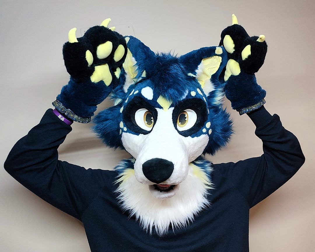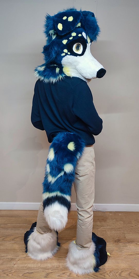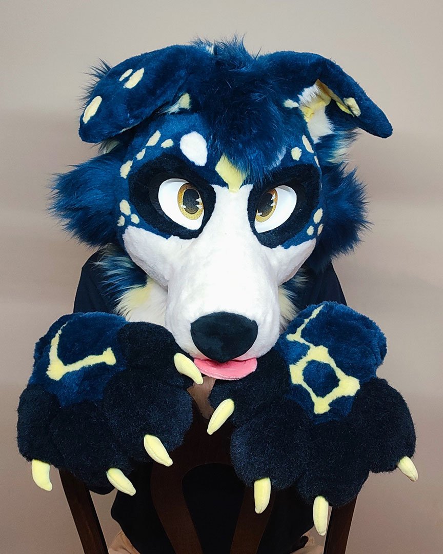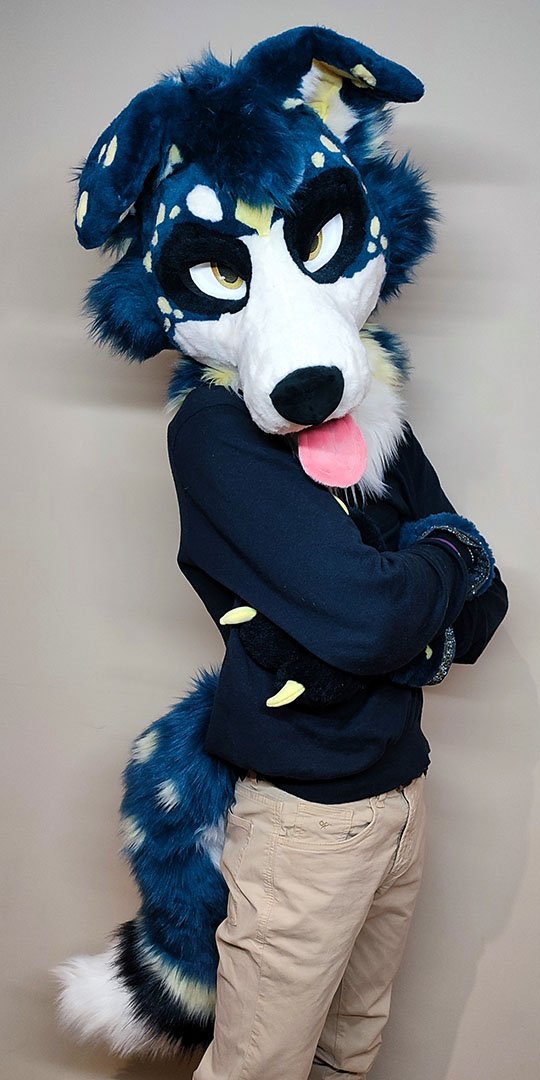 Head is modeled from scratch with foam, using as guide the canine patron from [url=https://twitter.com/Kloofsuits]KloofsuitsUK[/url]. Eyes are 3D printed in follow-me-eyes shape. Tongue uses pink minky and teeth are made with Fimo. Head is fully lined inside and has good vision. It also has as accesories a pair of magnetic eyelids and two different tongues which can be exchanged via magnets.